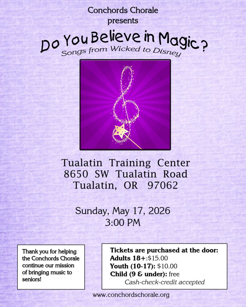 The Conchords Chorale are once again performing for the public. . Come hear a program full of pure Disney Magic.. Three public performances:. on April 26th in Fairview , on May 16th in Woodburn and on May 17th in Tualatin. . You may purchase tickets online for any performance.